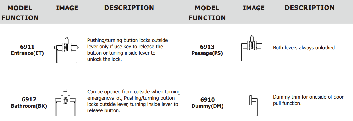 Function: DM(0:Dummy), ET(1:Entrance), BK(2:Privacy), PS(3:Passage)